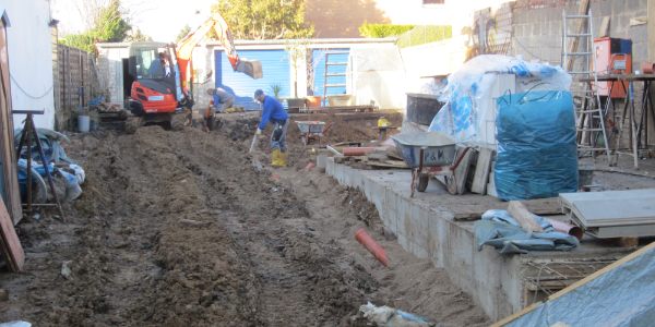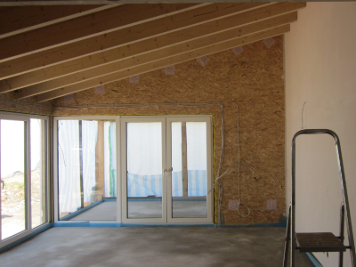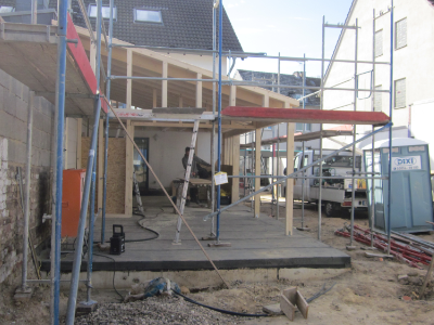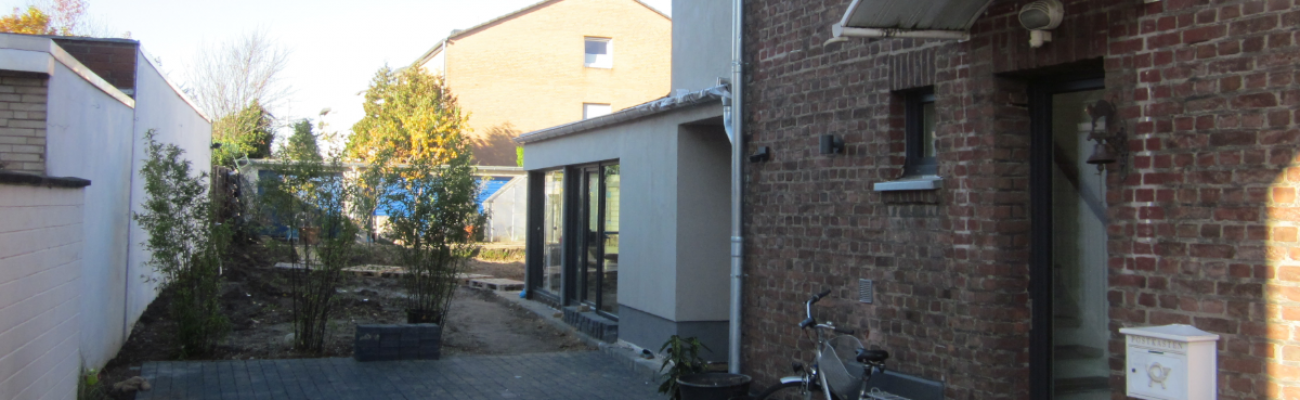 Das alte Einfamilienhaus wurde modernisiert und durch einen eingeschossigen Anbau aus Holzständerwerk erweitert, der feuchte bzw. nasse Keller von außen in den zugänglichen Bereichen freigelegt und gegen aufstauendes Sickerwasser abgedichtet. Die maroden Garagen wurden saniert und das Außengelände renaturiert. Die Heizungsanlage wurde auf eine solarunterstütze Luft-Wärmepumpe mit Fußbodenheizung im EG und Heizkörpern im OG und DG umgestellt.