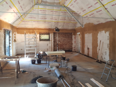 Die Innenwandflächen wurden in Eigenleistung von Ehrenamtlern mit Lehm verputzt. Das Projekt konnte mit dem sehr engagierten Förderverein, viel Eigenleistung und öffentlicher sowie privater Förderungen umgesetzt werden. Hier der Link zum Kulturraum, benannt als „Kulturscheune„.